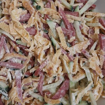 Салат с яичными блинчиками и колбасой основное фото рецепта
